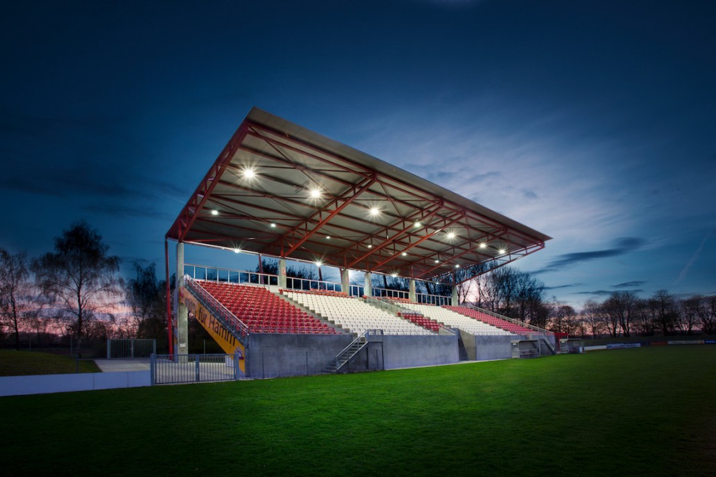 „Daher war es wichtig, eine wirtschaftliche Lösung zu finden“, erläutert Rainer Hentschel, Projektleiter bei Lehde. Im Zusammenspiel mit Architektur- und Ingenieurbüro wurden immer wieder verschiedene Varianten durchgespielt, bei denen auch alle Vorgaben und Anforderungen des DFB berücksichtigt werden mussten. So sind beispielsweise die Anzahl der Sitz- und Stehplätze oder die Abstände zwischen den Sitzen genau reglementiert. Damit steht einer sportlichen Aufwärtsentwicklung des Vereins jedenfalls nicht eine veraltete Tribüne im Weg.