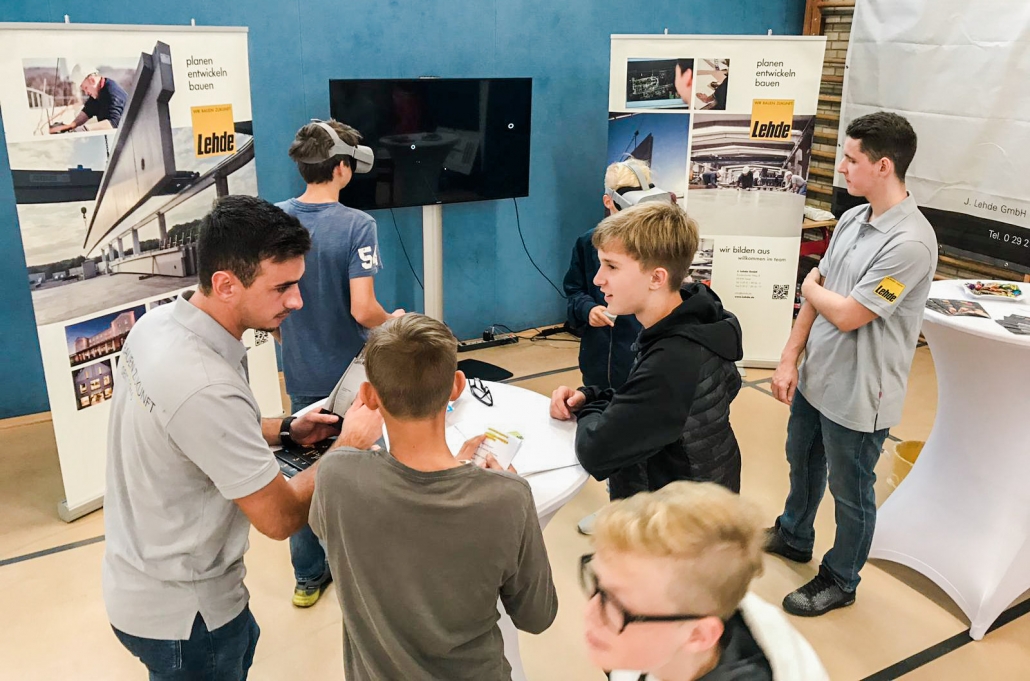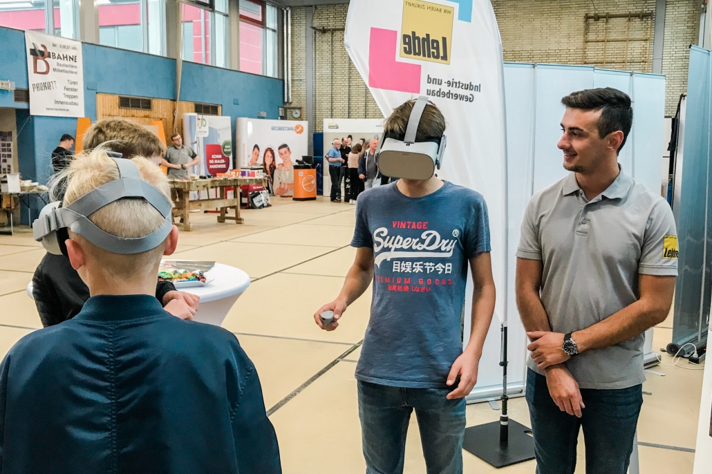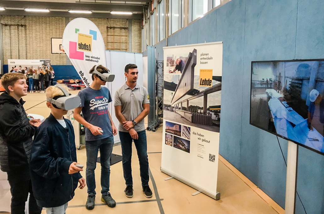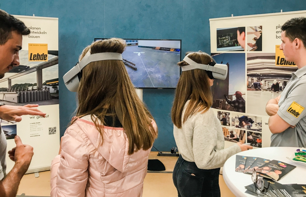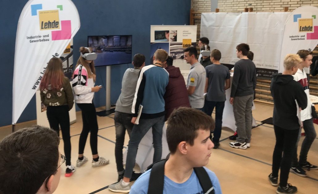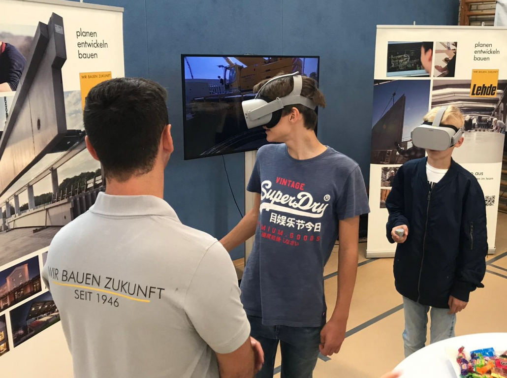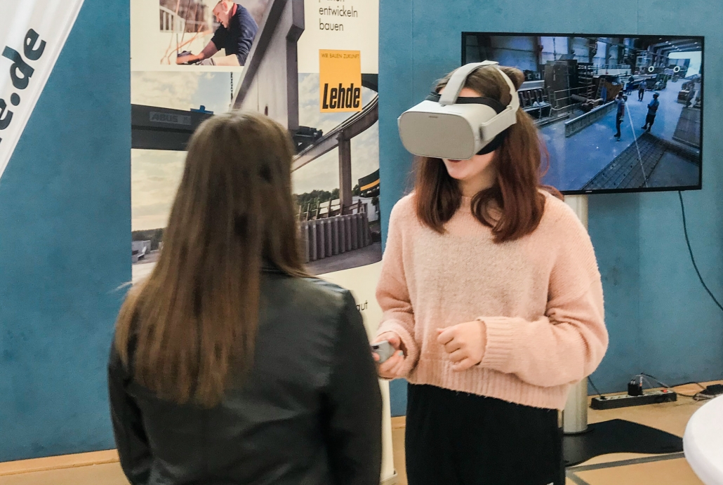 Dementsprechend drängelten sich die Schülerinnen und Schüler an unserem Stand und wollten die Brillen aufsetzen. Mit einem Zeigegerät konnten sie verschiedene Standortmarkierungen anklicken und „sprangen“ damit virtuell zwischen den einzelnen Szenerien hin und her. In den Wochen zuvor waren bei LEHDE im Werk und auf Baustellen Filmsequenzen mit einer 360-Grad-Kamera aufgenommen worden, so dass die jungen VR-Brillen-Träger quasi „mitten im Film“ standen und sich dort in Ruhe umsehen konnten.