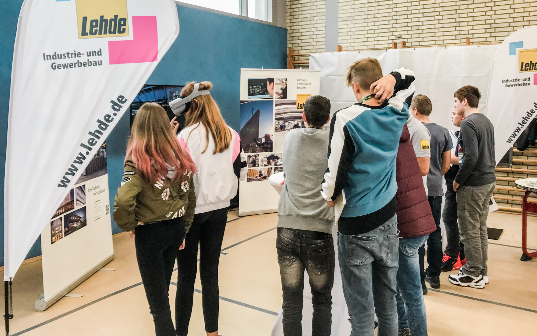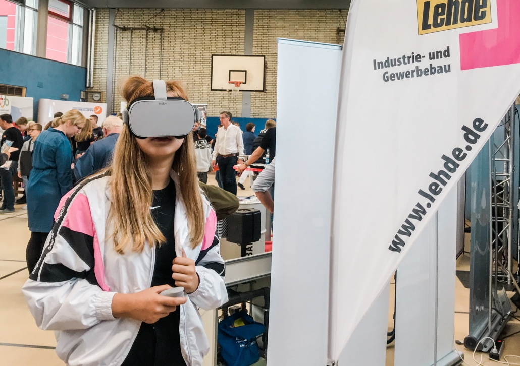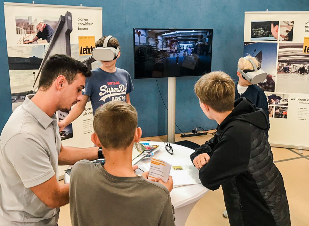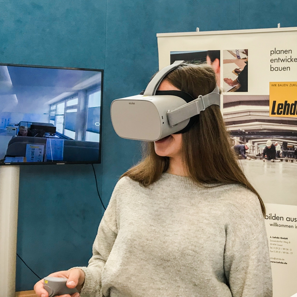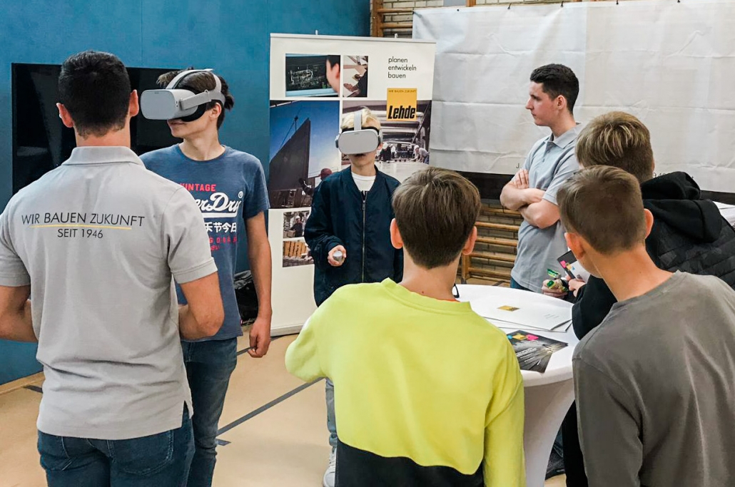 Dementsprechend drängelten sich die Schülerinnen und Schüler an unserem Stand und wollten die Brillen aufsetzen. Mit einem Zeigegerät konnten sie verschiedene Standortmarkierungen anklicken und „sprangen“ damit virtuell zwischen den einzelnen Szenerien hin und her. In den Wochen zuvor waren bei LEHDE im Werk und auf Baustellen Filmsequenzen mit einer 360-Grad-Kamera aufgenommen worden, so dass die jungen VR-Brillen-Träger quasi „mitten im Film“ standen und sich dort in Ruhe umsehen konnten.