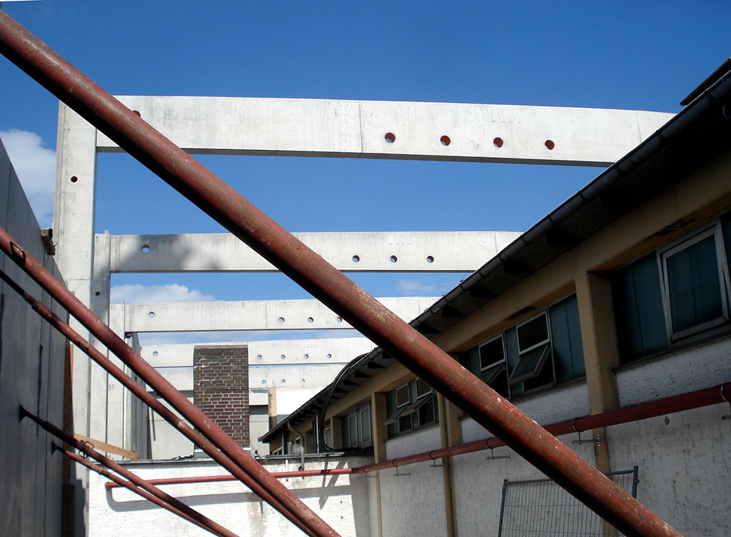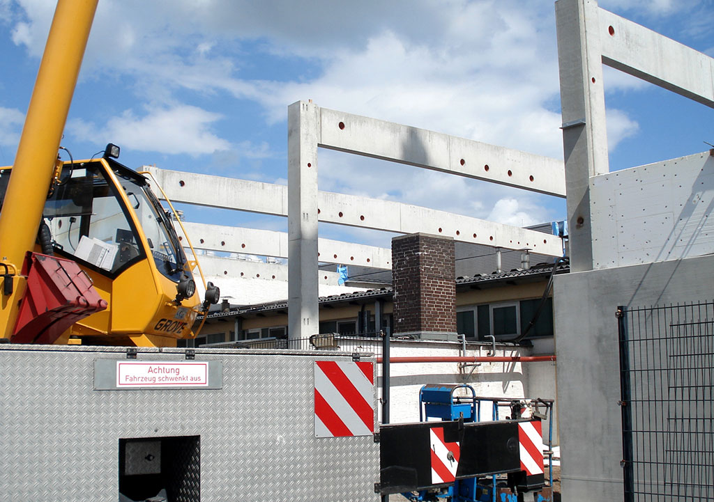 Damit der Bau so reibungslos und rasch wie nur möglich abläuft, setzten wir auf eigene Betonfertigteile. Diese werden analog zur Just-In-Time-Methodik der Autoindustrie direkt angeliefert und montiert. Puffer- und Lagerzeiten fallen somit komplett weg. Ähnlich effektiv verfahren wir auch mit dem Höhenunterschied auf dem Gelände – er beträgt bis zu sieben Meter.