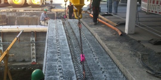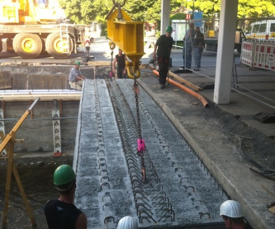 Die Montage der fünf Betonträger war binnen weniger Stunden abgeschlossen. Dabei galt es, einige schwierige Situationen zu meistern. Martin Butz, Geschäftsführer von Lehde, dazu: „Einer der Träger musste zentimetergenau unter das Gebäude der Sparkasse eingepasst werden. Wir hatten hier ungefähr drei Zentimeter Luft. Bei solchen Verhältnissen muss im Vorfeld sehr genau geplant werden.“ Für die Fertigung der Betonträger benötigte Lehde rund eine Woche im Stahlbetonfertigteilwerk in Soest. Die Montage dauerte hingegen nur rund fünf Stunden.